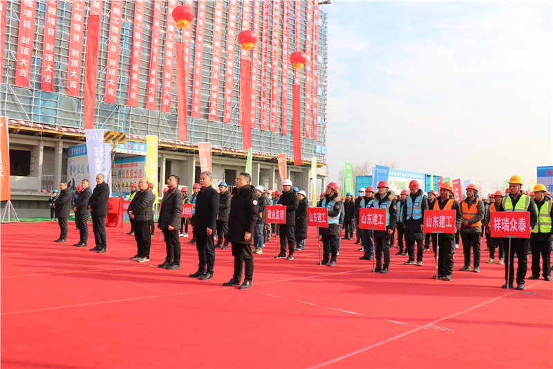 元月29日上午,集團承建的山東農業工程學院二期10號學生公寓喜封金頂。山東農業工程學院黨委書記張鴻波,黨委委員、副院長周吉鵬;淄博市教育局黨組書記、局長孫英濤;淄博市項目建設工作專班副主任李詠芹、耿慶永;集團黨委書記、董事長王彥宏,總會計師郭洪濤,副總經理、三直屬公司總經理宋吉鋒出席封頂儀式。