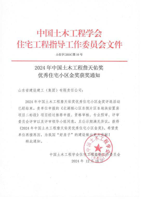 2024年12月,由山東建工集團(tuán)承建的北湖核心區(qū)東側(cè)片區(qū)B地塊安置房項(xiàng)目二標(biāo)段獲得中國(guó)土木工程詹天佑獎(jiǎng)優(yōu)秀住宅小區(qū)金獎(jiǎng)。今年全國(guó)共48個(gè)工程獲獎(jiǎng),集團(tuán)榜上有名。